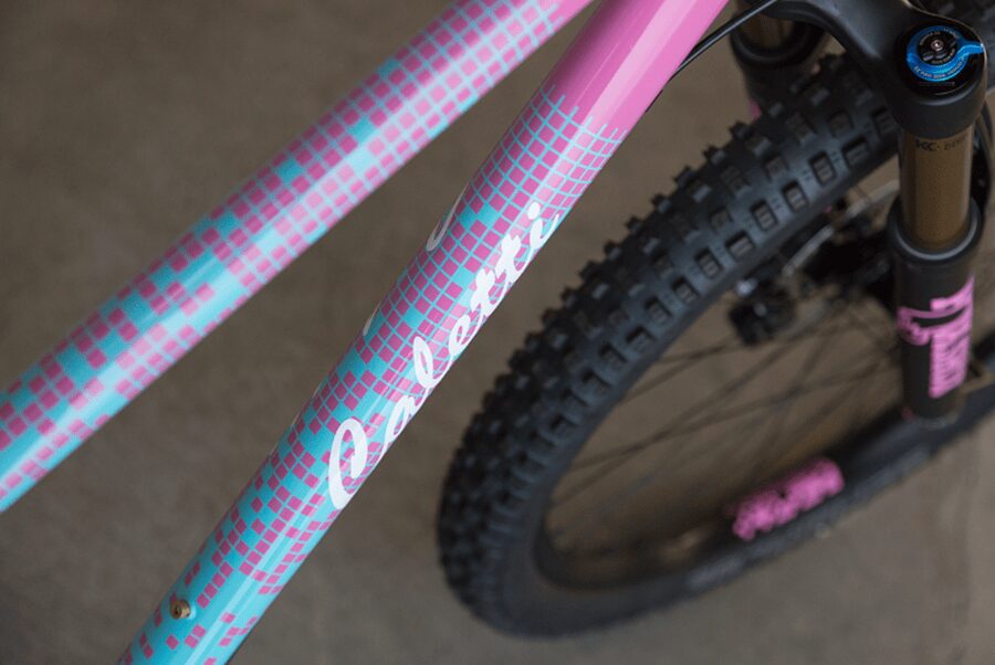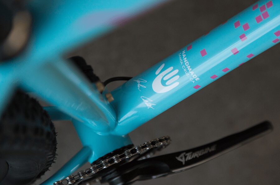 Covey Potter approached John Caletti with an unusual request in 2017. Both Santa Cruz locals, they shared an understanding of the area’s cycling culture and the importance of personal connection in custom builds. Potter wanted a single-speed mountain bike, but not just any single-speed. He carried with him a vibrant t-shirt from the 1985 Bay To Breakers race, asking Caletti to translate its design onto the frame. To complete the custom look, he added color-matched MTB grips for a pop of style and extra control on the trail.
