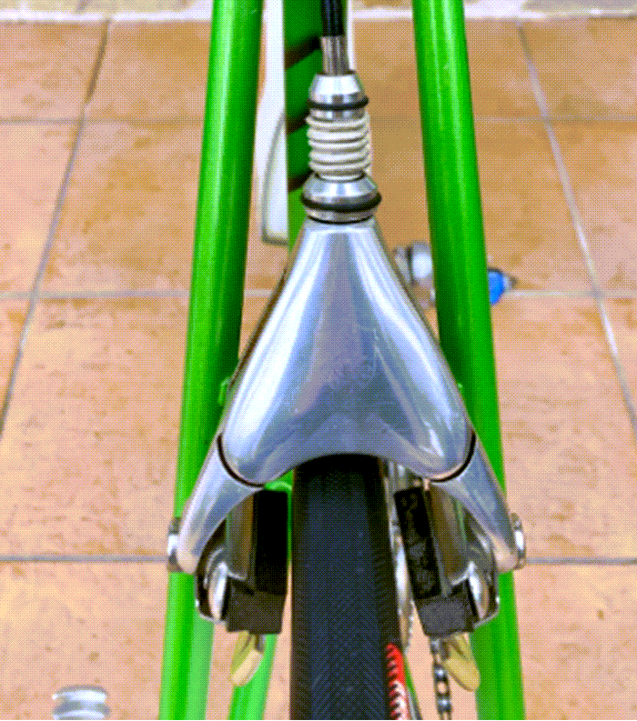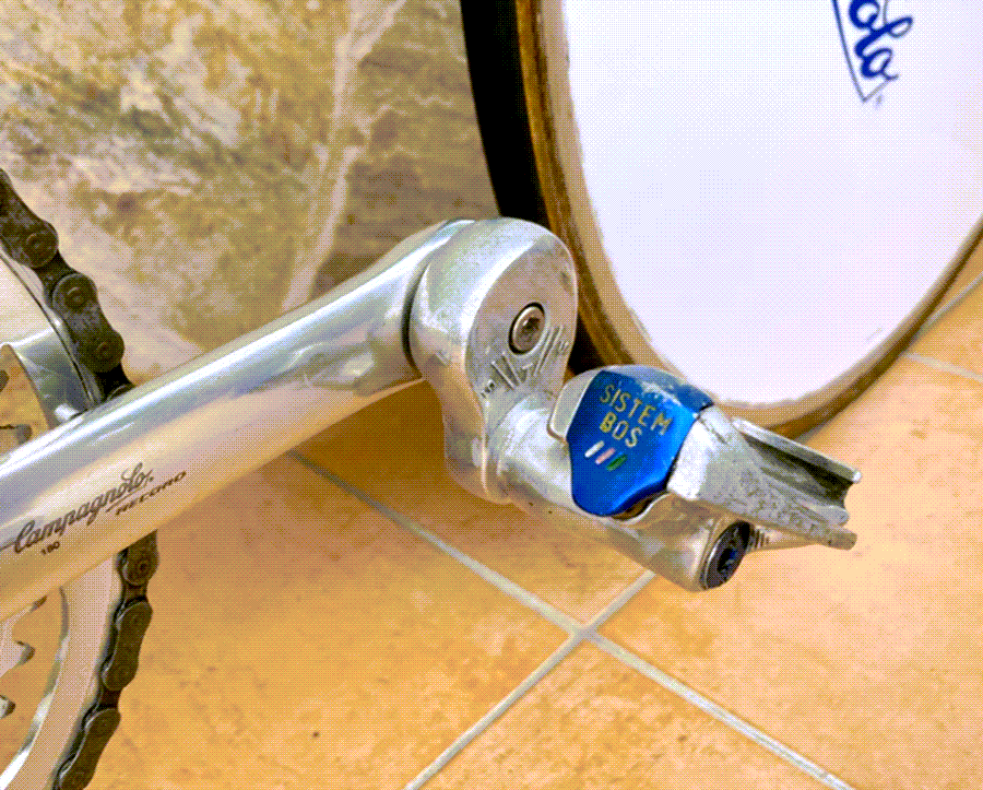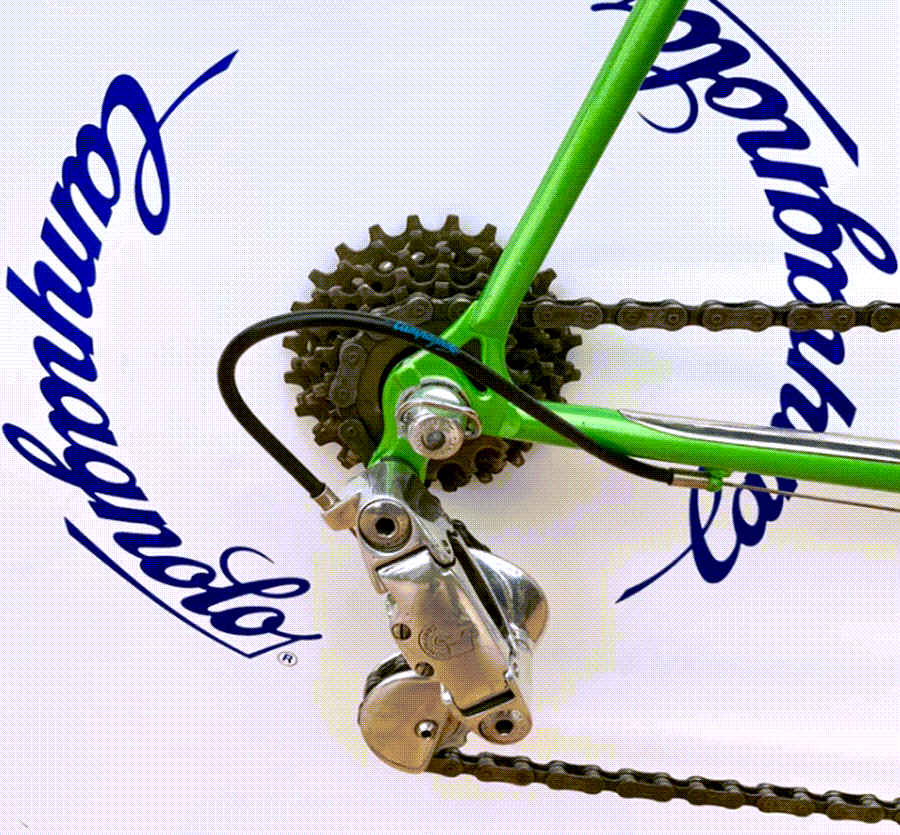 The Campagnolo C Record Delta brakes are the most mechanically complex component on this build. Delta brakes use an internal parallelogram linkage rather than a conventional single-pivot caliper. The mechanism is designed to equalize pad travel on both sides simultaneously, theoretically producing more even contact with the braking surface. In practice, Delta brakes are notorious for difficult setup and maintenance, which ultimately led Campagnolo to discontinue them. Paired with C Record brake levers, they are period-accurate and among the most sought-after components by Italian racing bicycle collectors.