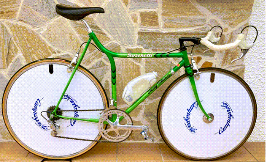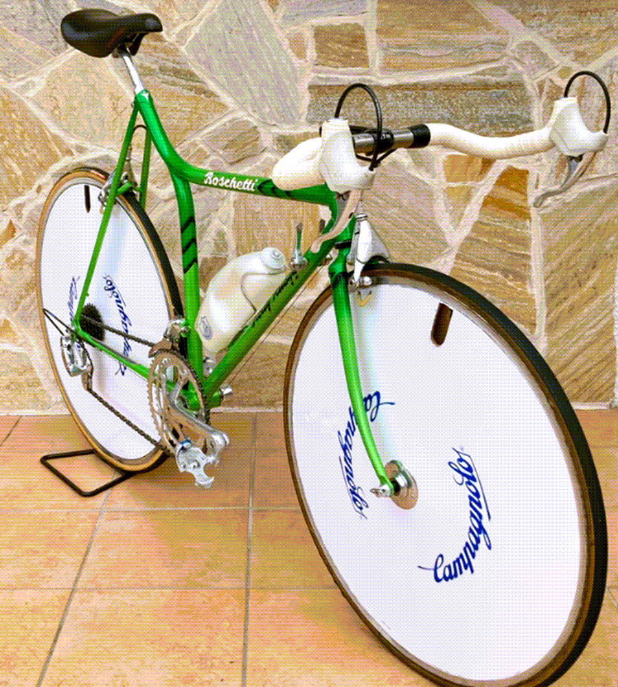 The Rino Boschetti Crono Lo Pro represents a well-documented, single-production-example of Italian lo pro framebuilding from the decade when this geometry defined elite pursuit and TT racing. Complete C Record builds in original, unmodified condition are increasingly scarce. The unique factory green paint, mixed-disc wheel configuration, and full component originality distinguish this from more commonly available Italian race bikes of the same period. At €5,000, the price reflects both the full C Record groupset value and the rarity of a Boschetti frame in rideable, complete condition.