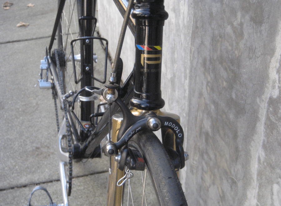 The brakes are Modolo Master Pros — a name that will mean something to anyone who followed professional road racing in the 1980s. These were the stoppers appearing on bikes in the Tour de France and the major European classics during this period, chosen for their modulation and reliability under race conditions. Akaki paired them with Modolo Professional handlebars and stem, the model that replaced the recalled Master SSC as Modolo’s top-tier bar offering. That context matters: these were not simply premium parts. They were the corrected, refined version of Modolo’s best work.