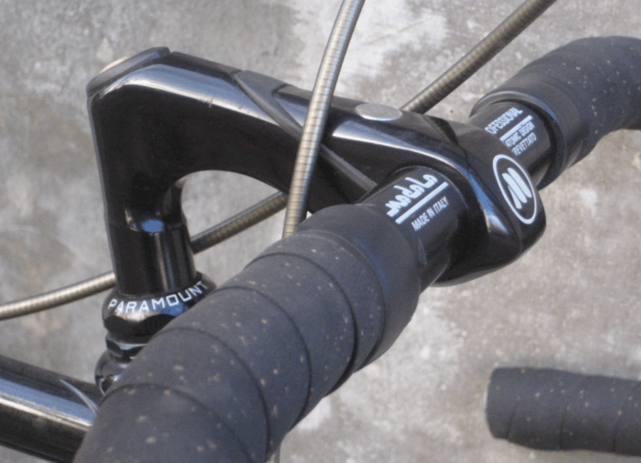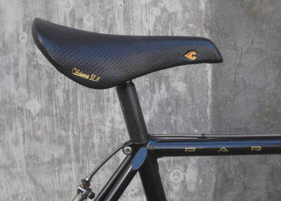 Why is the Tioga seatpost on this Paramount historically notable? The Tioga carbon fiber seatpost on this build was produced in 1988 and represents one of the first uses of carbon fiber in bicycle seatpost construction. At the time, carbon fiber was just entering the cycling component market, making this seatpost a genuine piece of materials history on an already significant machine.