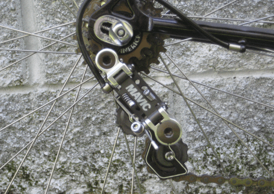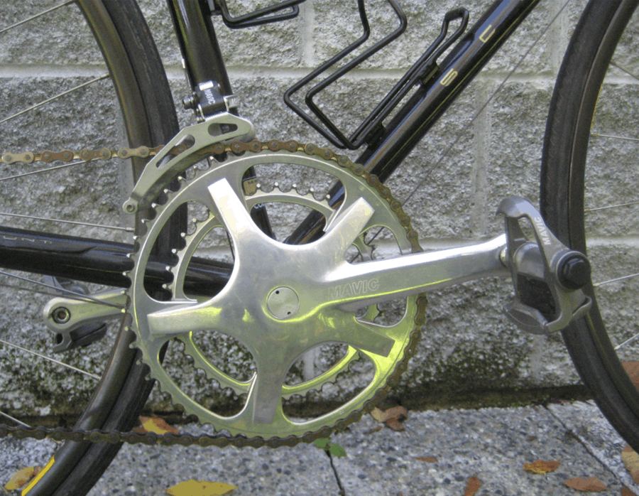 French manufacturer Mavic dominates the drivetrain. The Mavic 631 crankset, 851 rear derailleur, 810 front derailleur, 500 hubs, and Open 4 CD rims create a cohesive French performance package that was at the absolute top of the market in 1988. The Look pedals, badged under Mavic’s label following Look’s partnership with the brand, complete the picture. This was the groupset configuration that serious European racers and well-informed American enthusiasts were specifying at the time.