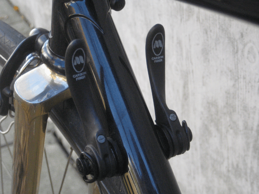 Then there is the carbon fiber. The Tioga seat post on this build is one of the first carbon fiber seat posts ever produced — made in 1988, the same year as the frameset, when carbon was appearing in cycling components for the first time in any serious way. The Modolo shift levers also feature early carbon fiber construction, another instance of cutting-edge material application at a moment when the industry was just beginning to understand what the material could do.