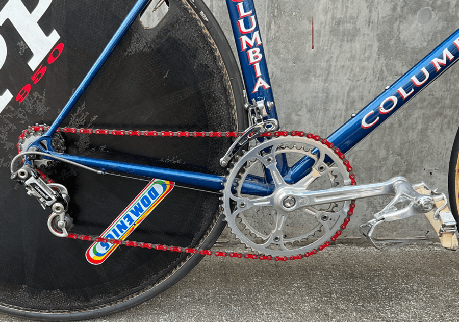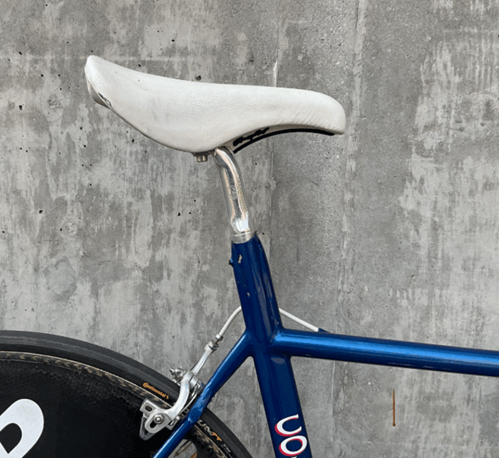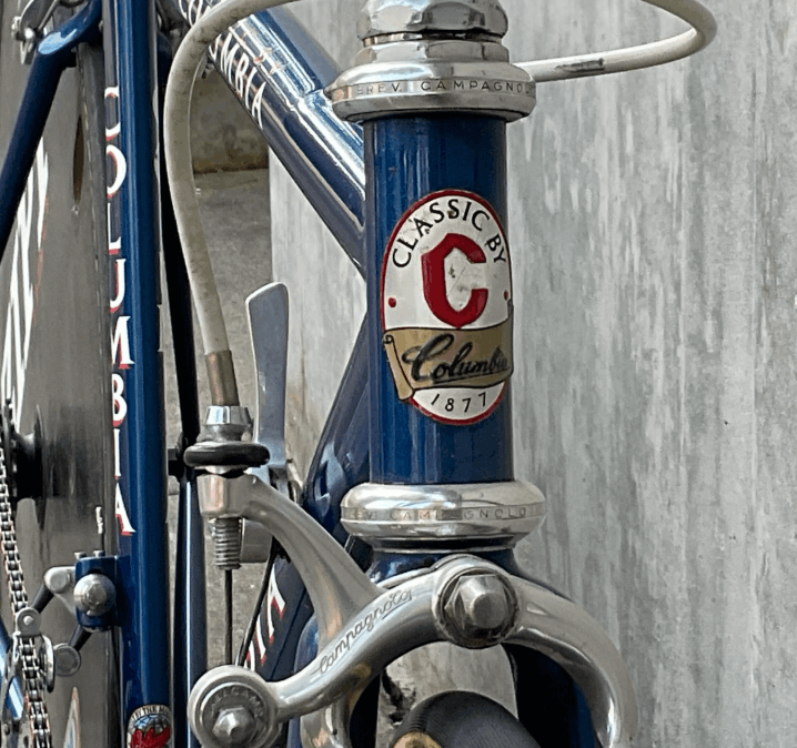 Q: Why does the bike say “Columbia” if it’s a custom race bike? Classics by Columbia was Steve Hegg’s sponsor at the time. The Columbia decals and headtube badge were applied as sponsor branding, not because Columbia actually manufactured the frame. Classics by Columbia was known for cruisers and utility bikes — not time trial machines.