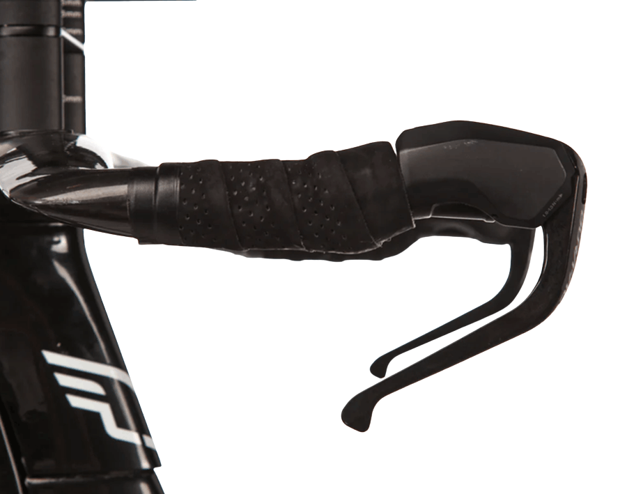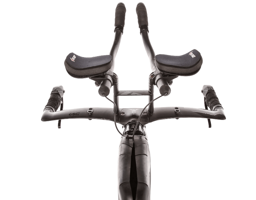 The handlebar is a Devox Dagger UHC Ultimate + Nano base bar at 42cm width, integrated with the frame’s front-end system to minimize aerodynamic drag. Extensions are Zipp Vuka Evo 110 carbon, a stiff and lightweight option commonly used in professional triathlon. Arm pad positioning allows customization for different torso lengths and aero positions. The seat post is Felt’s VariMount Aero Tri UHC Advanced carbon, frame-specific, and designed to allow precise fore-aft saddle adjustment within the steep-angle geometry.
