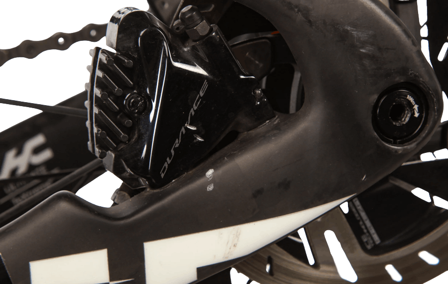The crankset is a Shimano Dura-Ace R9100-P, which incorporates a left-arm power meter for watt-based training and race pacing. Gearing is 52/36t chainrings with an 11-28t cassette — a range suitable for flat and moderately hilly Ironman courses. The rear derailleur runs a CeramicSpeed OSPW (Oversized Pulley Wheel System), which reduces drivetrain friction measurably and is a common upgrade on professionally maintained race bikes.